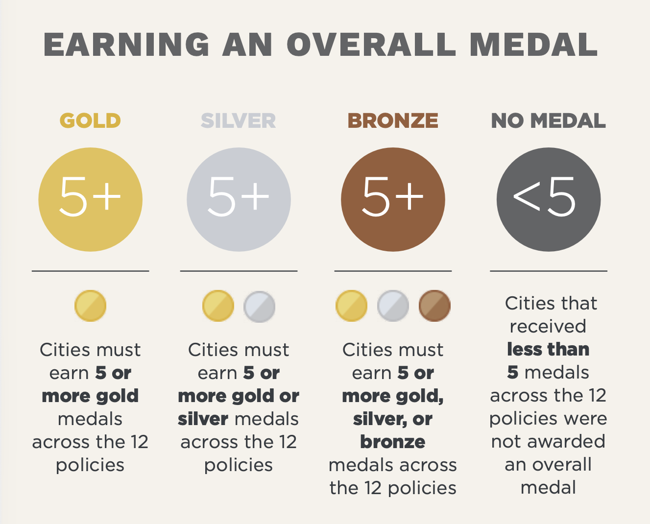 Eight exemplary cities rose to the top by earning overall gold medals: Boston, Chicago Denver, Minneapolis, New Orleans, Portland, San Antonio, and St. Louis — with Chicago earning its first overall gold under the current policy package, having previously earned an overall silver.